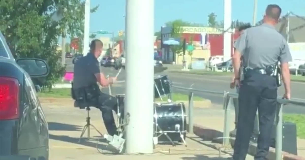 Last Friday, our officers were called to a loud noise complaint in south OKC. When they got there, they found a man set up playing drums. Officer Nate Ross was the first to arrive. He chatted with the man, explaining that they had been called there because someone was complaining that the music was too loud. Little did anyone know that Officer Ross used to play the drums back in the day. Someone happened to capture Ross sitting down, showing them how it was done.